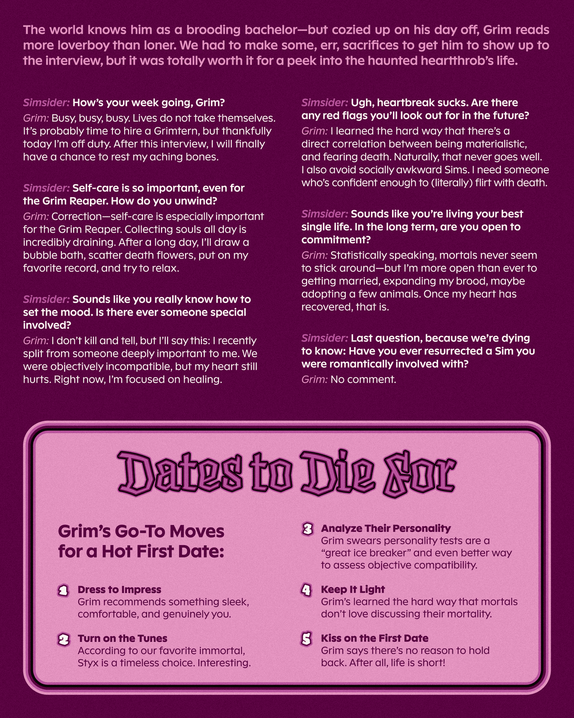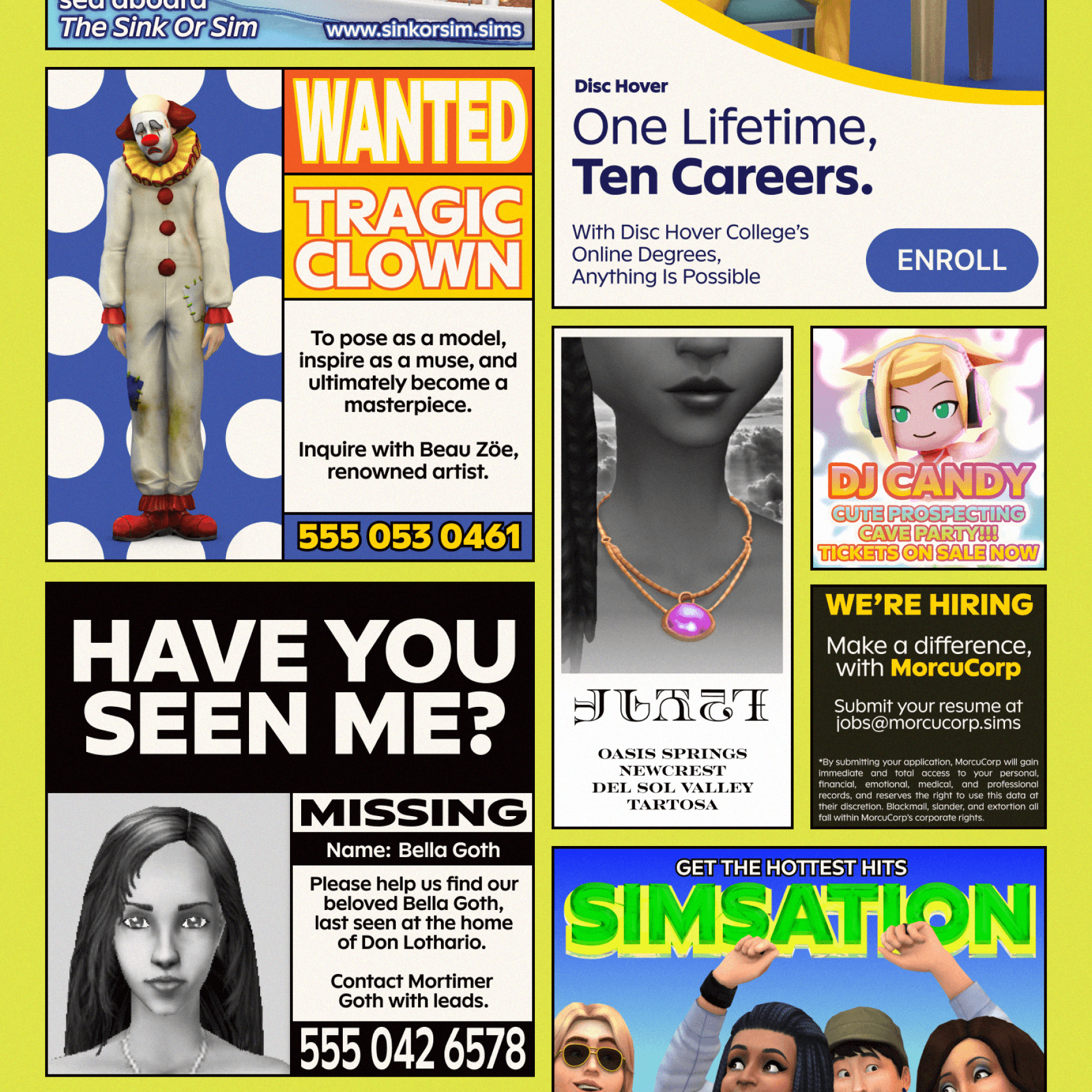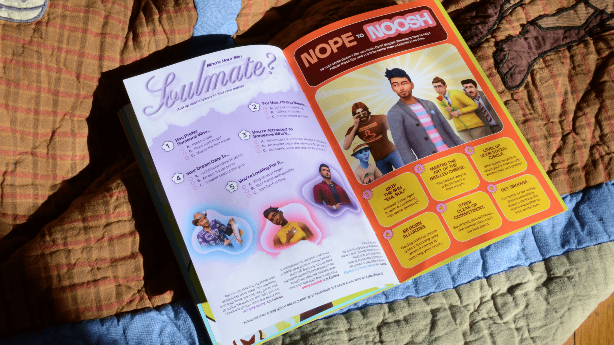 The Sims was born in the year 2000, when tabloids teemed with hot gossip, and teen magazines delivered romantic advice in the form of cutesy quizzes. With this early-aughts literature as our muse, we dreamt up a Simmified version of a 2000s teen magazine. It was the perfect format to lean into The Sims’ famously scandalous storylines, quirky characters, and offbeat humor. Loaded with IYKYK Sims lore, Y2K indie sleaze pop, and the flashy aesthetics that defined the era, Simsider Magazine fused the best of Sims with the best of the early 2000s.